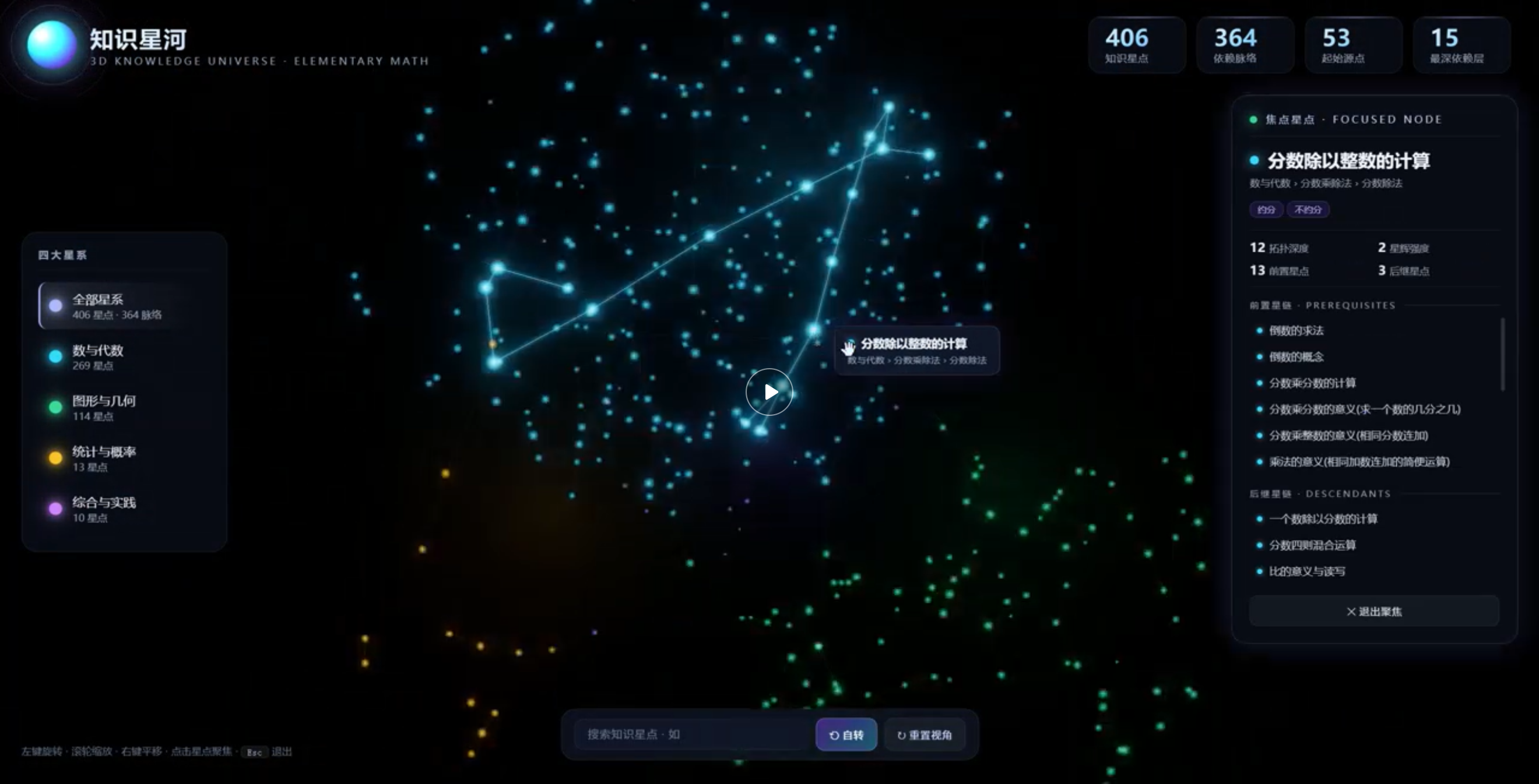 406 颗知识星点、364 条依赖脉络,将小学数学全部知识构建为可交互的 3D 星空宇宙。